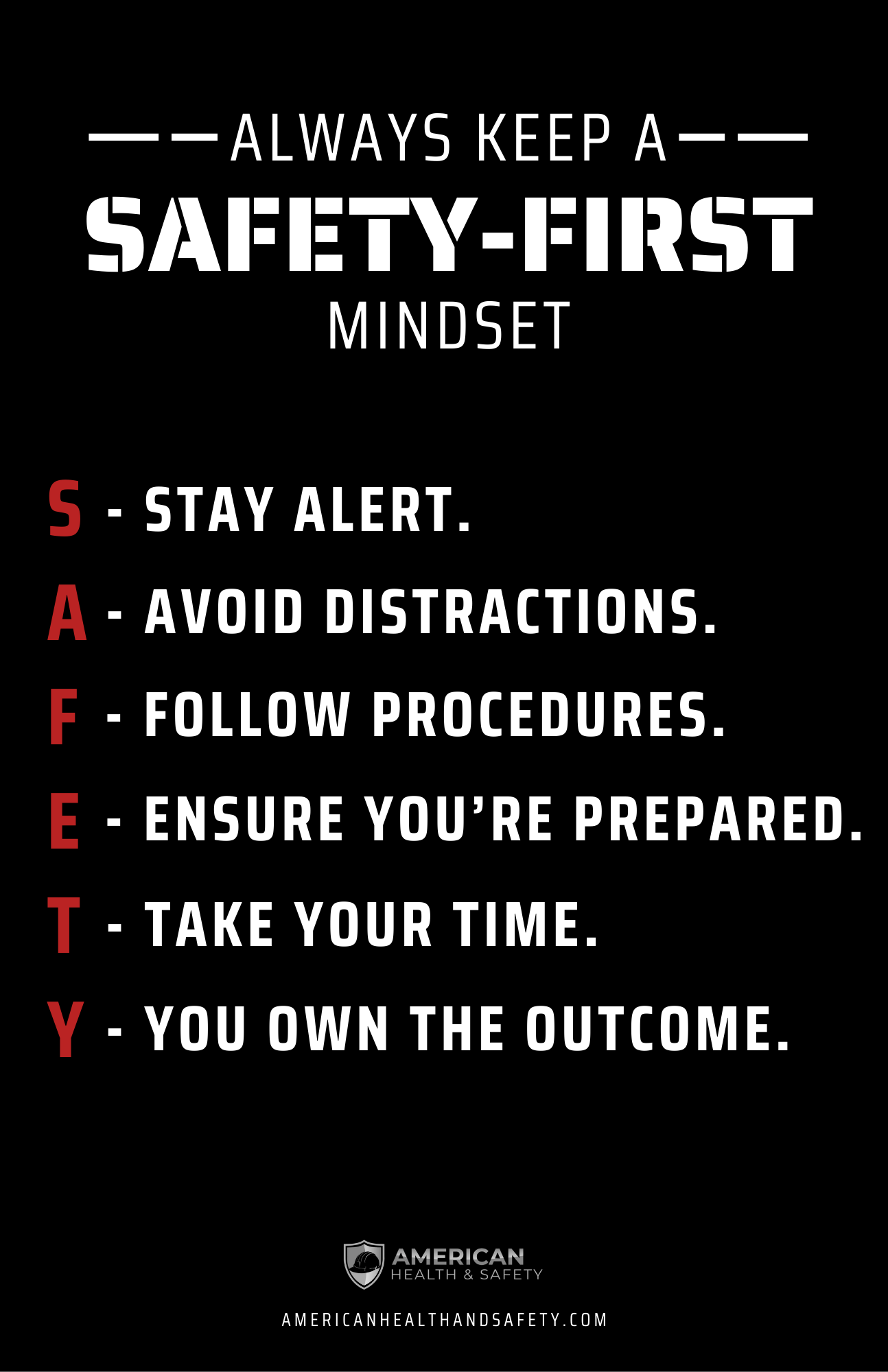 Reinforce accountability and safe decision-making with this bold, high-impact “Safety-First” poster. Built around the SAFETY acronym and anchored by the message “You Own the Outcome,” this design promotes personal responsibility, procedural discipline, and proactive hazard awareness. Ideal for manufacturing floors, warehouses, job sites, and training rooms to strengthen safety culture and daily mindset.